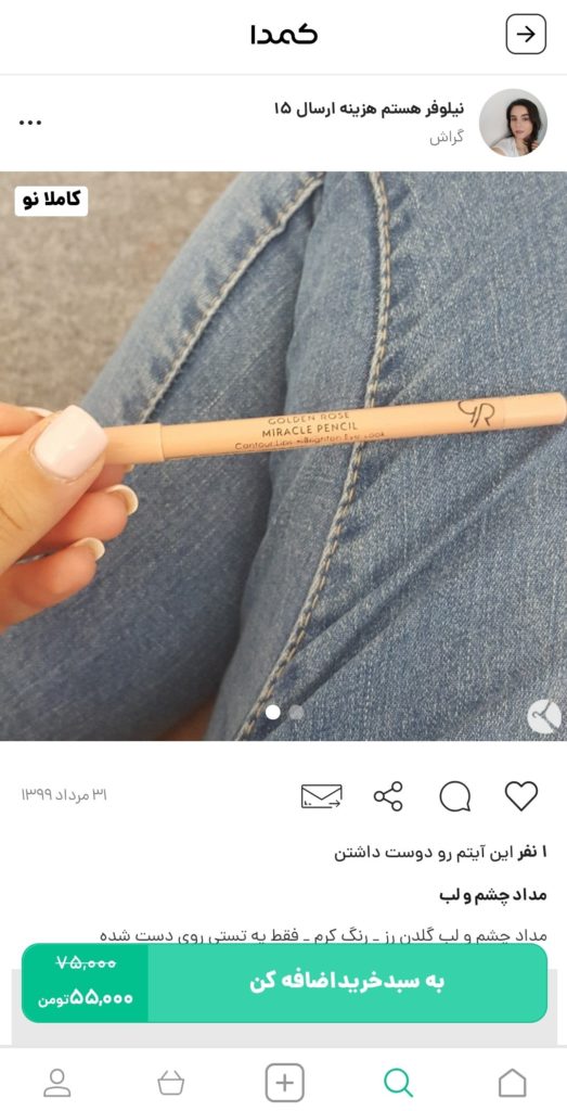 حال که با مداد چشمهای وسوسه برانگیز و زیبای این برند، آنشا شدید؛ نوبت به خرید آنها میرسد. برای خرید مداد چشم گلدن رز پیشنهاد ما به شما خرید از اپلیکیشن کمدا است. با اپلیکیشن کمدا، تجربه لذتبخش خرید کالاهای متنوع و باکیفیت، همراه با تخفیفهای همیشگی و گارانتی پرداخت را به خود هدیه دهید. به علاوه، شما با نصب اپلیکیشن کمدا، میتوانید کالاهای نو یا در حد نوی خود را نیز با قیمتهای مناسب، به راحتی به فروش برسانید و صاحب یک فروشگاه کوچک مجازی شود یا کمد شلوغ خود را خلوت کنید. در ادامه نمونهای از مداد چشم برند گلدن رز موجود در کمدا را مشاهده میکنید: